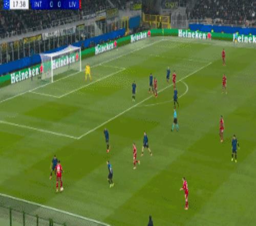 上半场补时第6分钟,巴斯托尼左路传中,落点恰到好处,劳塔罗力压范戴克头槌攻门,阿利松回敬精彩扑救,利物浦险些压哨丢球。